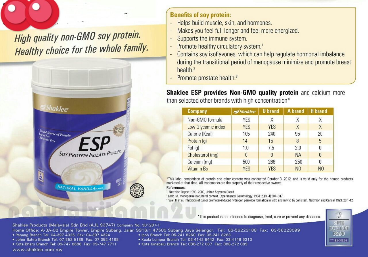 Serbuk ESP Shaklee merupakan sumber protein soya terbaik. ESP menyediakan 14 gram protein soya bukan-GMO berkualiti tinggi dengan semua asid amino yang tubuh anda perlukan bagi proses sintesis protein termasuk sembilan asid amino penting. Berbanding protein daripada sumber daging, telur dan tenusu, ESP adalah rendah lemak dan bebas laktosa dan kolesterol.